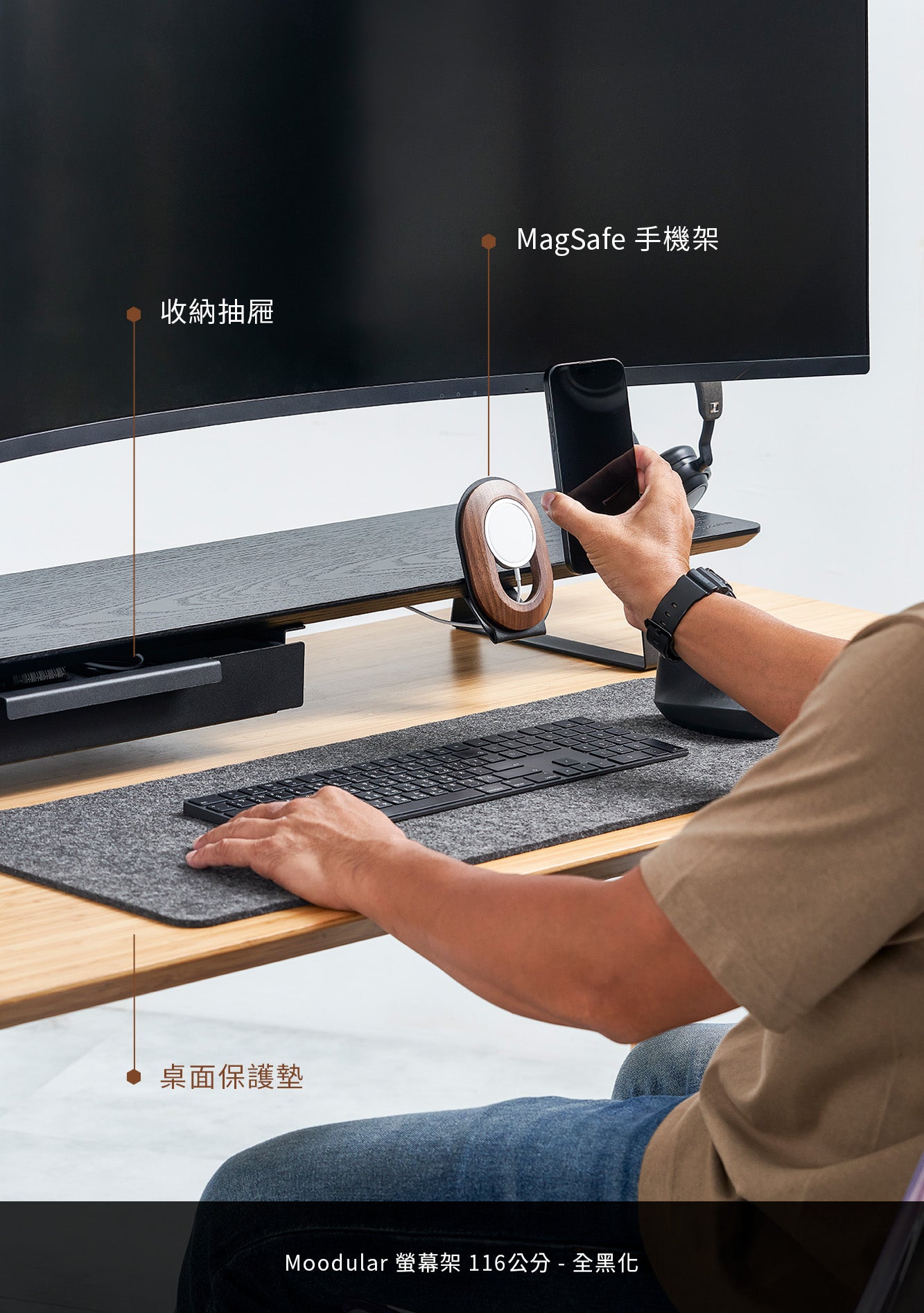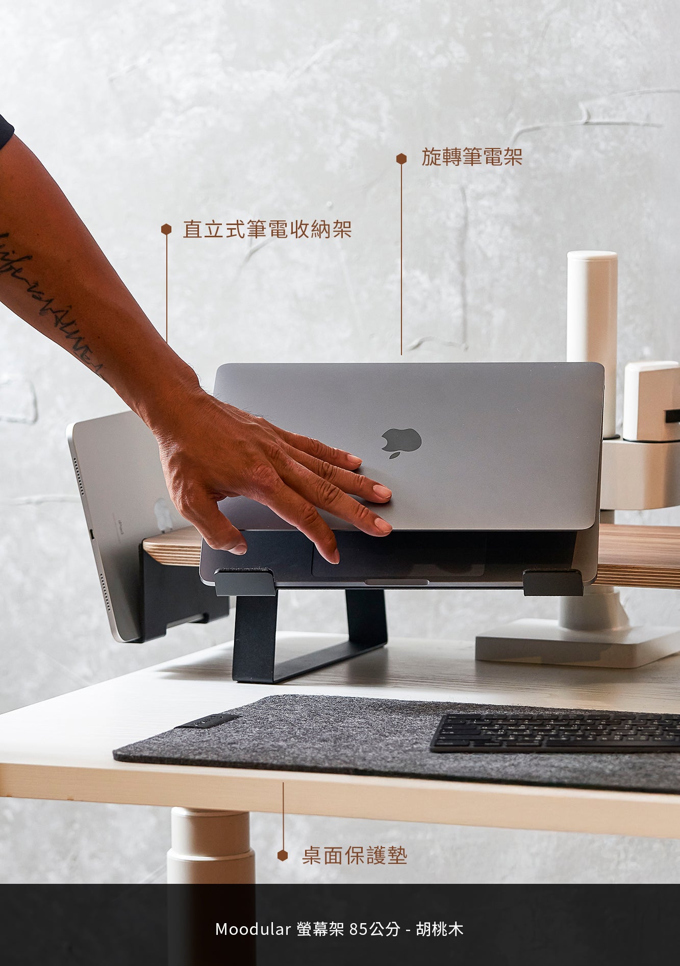 一般桌板在螢幕的長期重壓後,容易產生凹陷的疑慮,Moodular 採用「內坎的金屬滑軌設計」徹底解決此疑慮,更讓總承重上升至65公斤。